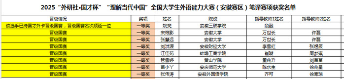 我校文学部翻译专业学生姚亮凭借扎实的语言功底与出色的综合能力,在英语笔译及英语综合能力两项赛项中斩获一等奖,并成功晋级全国总决赛;日语(专升本)专业郑豪同学以全省第五名的成绩获日语赛项一等奖,成功晋级国赛;英语专业李情怡、李畅同学获英语演讲赛项三等奖,时兆媛同学获英语笔译赛项三等奖;人工智能专业何祥继同学获短视频赛道三等奖。