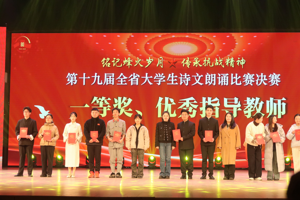 11月28日,由安徽省教育厅主办的第十九届全省大学生诗文朗诵大赛决赛在安徽师范大学落下帷幕。我校学子朱康健同学凭借扎实的语言功底、精湛的朗诵技巧和深厚的情感积淀,获非专业组一等奖,莫星月同学获二等奖,姚玉婷、周珺、李豹、程柯柯同学获三等奖。文学部教师梁学翠、刘慧获评“优秀指导教师奖”。
