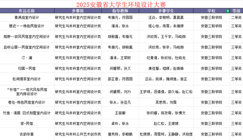 在2025年安徽省大学生环境设计大赛中。作品《青满庭室内设计》荣获室内空间设计类二等奖;《松间慢茶室内设计》等10项作品荣获三等奖。