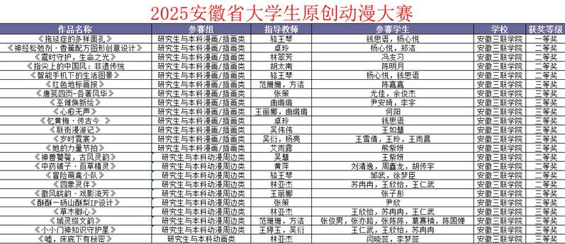 在2025年安徽省大学生原创动漫大赛中,作品《拖延症的多样面孔》荣获漫画/插画类一等奖;《中药铺子·百草精灵》、《徽风皖韵·戏影流芳》等作品分获各品类二、三等奖。