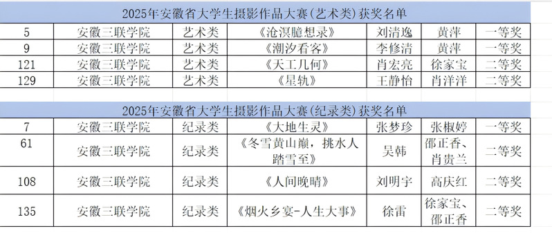在2025年安徽省大学生摄影作品大赛中,作品《沧浪随想录》、《潮汐看客》、《大地生灵》荣获一等奖,《天工几何》等作品获得二等奖。